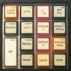 On the right end of the keyboard panel is a group of fifteen keys used for various control and programming functions. The [LOAD PROG] and [RECORD PROG] keys are used with the magnetic tape cassette deck to recall and save programs from/to the tape. The [SEARCH] key, and its shifted function "MARK", are used for branching operations, with MARK used to set a label as a destination for a branch, and SEARCH used to branch to a given label. The [J IF 0] and [J IF +] keys are used for testing the display for zero or positive numbers, and branching if the condition is true. Shifted versions of these conditional test keys allow for branching if the calculator has detected an error condition, and if the content of the display is non-zero. The [RECALL] key, [and its shifted function "STORE", allow direct access to the memory registers of the calculator by pressing the [STORE/RECALL] key followed by one of the sixteen memory register selection keys. More on why the [STORE/RECALL] key exists in the section on the memory architecture of the calculator. The [PRINT] key causes the content of the display to be printed on the optional built-in printer, with a shifted function allowing access to limited alphanumeric labeling features of the printer. The [INDIR] key is used to provide indirect access to memory registers, using the content of a memory register to serve as a 'pointer' to another memory register. The [I/O], [GROUP 1] and [GROUP 2] keys are used to control input and output to/from the calculator from externally connected peripheral devices. The [GO] key initiates execution of a stored program, and the [STEP] key allows a program to be executed one step at a time for debugging purposes. The [SET PC] key allows manual setting of the program counter, and the [VERIFY PROG] key generates a checksum of a program stored in memory to allow verification that a program properly loaded from the cassette tape. Shifted versions of the [SET PC], [VERIFY PROG] and [RECORD PROG] keys allow for editing of programs in memory, including deleting and inserting program steps.