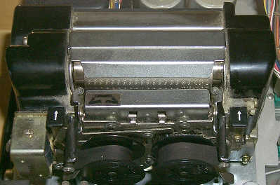 The printer uses a drum and hammer approach to print on a wide paper tape. A drum with embossed characters spins behind the paper at a rate of approximately 300 RPM. Positioned in front of the paper is a row of 21 hammers. Located between the hammers and the paper is an inked ribbon. When the character to be printed in any given position is coming into position as the drum spins, a solenoid causes the hammer to move forward and strike the ribbon at just the right time to cause an inked impression of the character to be deposited on the paper. A total of seven solenoids control the hammers, with each of solenoid shuttling across three different hammers to timeshare the solenoids. The printer prints a total of 120 lines per minute, or two lines per second. The printer is positioned under a clear plastic cover that can easily be removed to allow loading paper and replacing the ribbon. A push-on/push off switch on the keyboard panel turns the printer on when activated. If commands are given that reference the printer when the printer is powered off, the command is simply ignored.