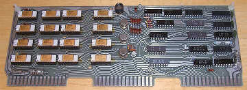 The circuit boards are made of fiberglass, and have etch on both sides of the board, with plated-through feedthroughs connecting the two sides of the board. The logic used is all standard 7400-series TTL, with small and medium-scale devices. Only three of the main logic boards have obvious functions, with the front-most board dedicated to driving the printer, the next to the back board containing the calculator's IC-based memory, and the rear-most board appearing to be involved in I/O interface functionality.