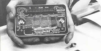 The program and register storage technology in the 600 is noteworthy, as it is a departure from Wang's tried-and-true magnetic core memory technology used in its earlier calculators. The memory is implemented with sixteen Mostek MK-4008 dynamic RAM (Random Access Memory) devices. The MK-4008 was one of the early 1024-bit RAM chips, with each chip organized as 1024 individual bits. The MK-4008 is a dynamic RAM, meaning that the content of the memory cells must be periodically refreshed, or the content of the memory cell will bleed off. The state of a memory cell in a dynamic memory device is stored in a tiny capacitor. Capacitors store electrical charges, however, they can not store a charge indefinitely. The act of refreshing the memory cells periodically assures that a '1' stays a '1'. The MK-4008 is rather a famous chip, because it was found that if the lid covering the IC die was carefully removed from the package, the chip itself was light-sensitive. Popular Electronics magazine had an article that appeared in the February, 1796 edition that used a modified MK-4008 memory chip as the image sensor for a do it yourself all-solid state video camera called "Cyclops", with 32 X 32 pixel resolution.