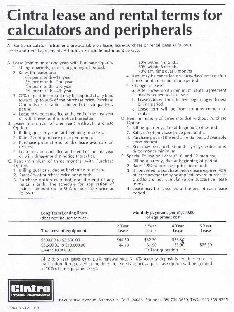 Data sheet for Lease/Rental of Cintra Calculators, April, 1971.