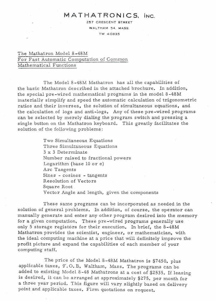 Information sheet for Mathatronics Mathatron 8-48M (Version I)