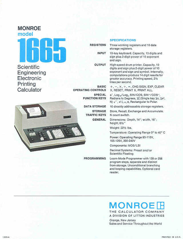 Specifications Sheet for Monroe 1665 Calculator, Circa 1970.