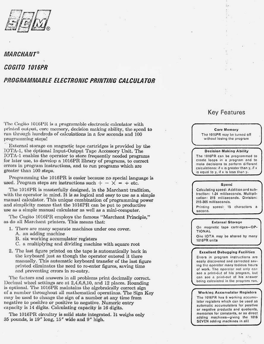 Data Sheet for the SCM 1016PR Calculator Mid-1969.