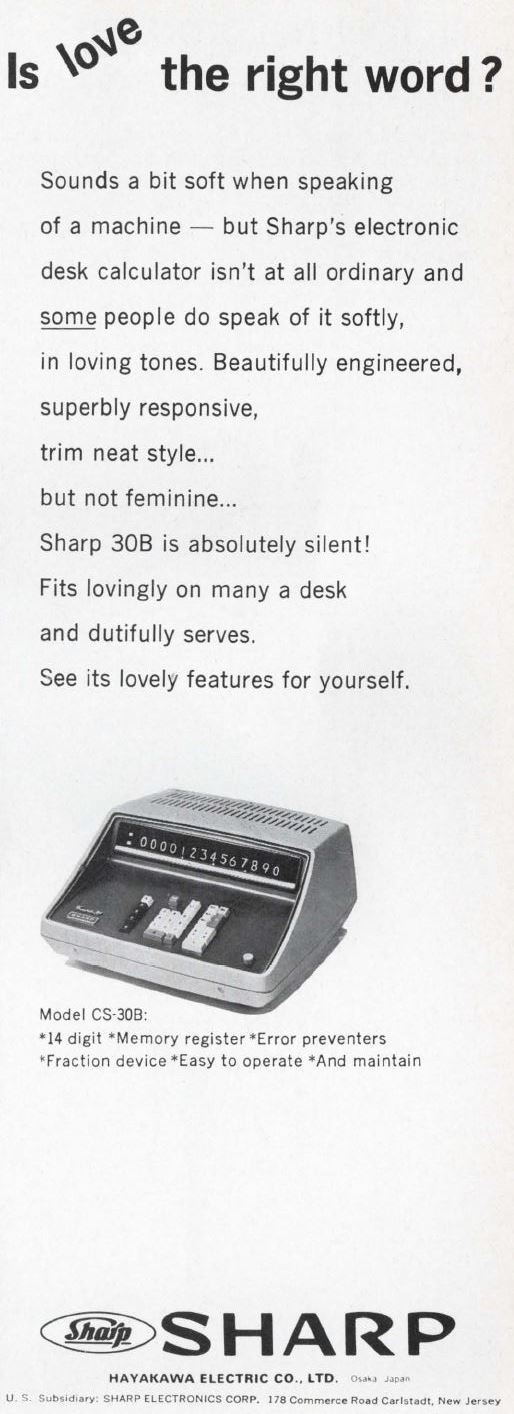 Advertisement for Sharp Compet 30 Model CS-30B Electronics Magazine, October, 1967.