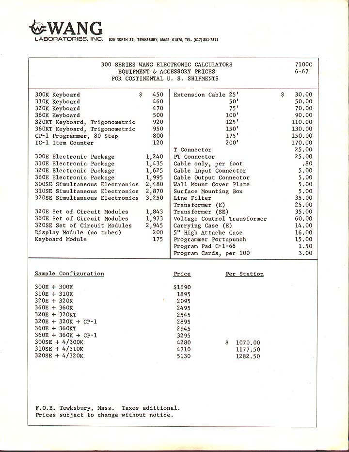 Wang Labs June, 1967 300-Series Price List Document made available through the generosity of Mr. Doug Coward.