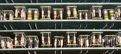 The Programma 101 is a truly fantastic machine for its time, with a magnetostrictive delay line for register storage, and beautifully made circuit boards that use what is called cordwood construction, which allows the boards to stack one atop the other with the cordwood modules interleaving between the boards, making for higher density circuitry than traditional circuit board technology, as well as simply looking beautiful. The cordwood modules were standardized with each different module having a specific function, so that troubleshooting was fairly straightforward. Once a failing module was identified, there were between 4 and 8 wires connecting the module to the circuit board that could easily be de-soldered, and a replacement module soldered in its place. The printing mechanism is an ingenious combination of a serial printer and a drum and hammer printer. A single solenoid-operated hammer rides on a carriage that moves back and forth across the paper, with the hammer firing into the paper at the instant when the print drum behind the paper is in the correct position to cause the desired digit or symbol to print when the hammer presses the ribbon against the paper, leaving the printed character on the paper. It's magical to watch in operation, though a bit on the noisy side. The magnetic card reader marks the first ever use of such a device for offline storage for an electronic calculator. The next calculator to use such a device was Hewlett Packard's 9100A. Hewlett Packard ended up having to pay a royalty to Olivetti for each 9100A and 9100B calculator sold because of the similarities between their magnetic card devices and Olivetti's. Olivetti had wisely patented their design in the US, given Hewlett Packard little choice but to pay the royalty fee.