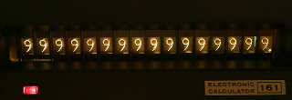 Each display element contains twelve of these plastic panels engraved with the digits zero through nine, a right-hand decimal point, and a vertical bar situated to the right of the digit that is used both for grouping results into groups of three for easier reading, and for separating the multiplicand and the multiplier when performing multiplication operations. The vertical bar lights up green (a result of a green coating on the edge of the panel that the bar is engraved in) to make it contrast against the yellow-white digits and decimal points. The calculator does not perform any leading or trailing zero suppression, which seems somewhat of an omission on a machine with an incandescent lamp-based display that requires tedious replacement of a lamp if it burns out. It seems that suppressing display of unnecessary zeroes would have extended the life of the tiny lamps that light up the digits. It is suspected that Canon service technicians simply replaced an entire digit module if one of the lamps in a module burned out, as replacing the individual lamps is a very delicate operation requiring a lot of time.