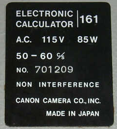That machine was dubbed the Canon 130. By October of 1964, Canon had put the 130 into volume production and built up a sales organization, and the machine hit the market, quickly proving that Canon Camera and Instrument Co. was indeed a player to be reckoned with in the rapidly expanding electronic calculator marketplace. Within the period of a year, Canon had introduced a number of other calculators based on this first generation design. In November of 1965, the 161 was introduced, making it the Top-Of-The-Line in Canon's first generation of electronic calculators. Also included in this first generation was the Canon 151, which was essentially a cost-reduced version of the Canon 161 that omits one digit of capacity.