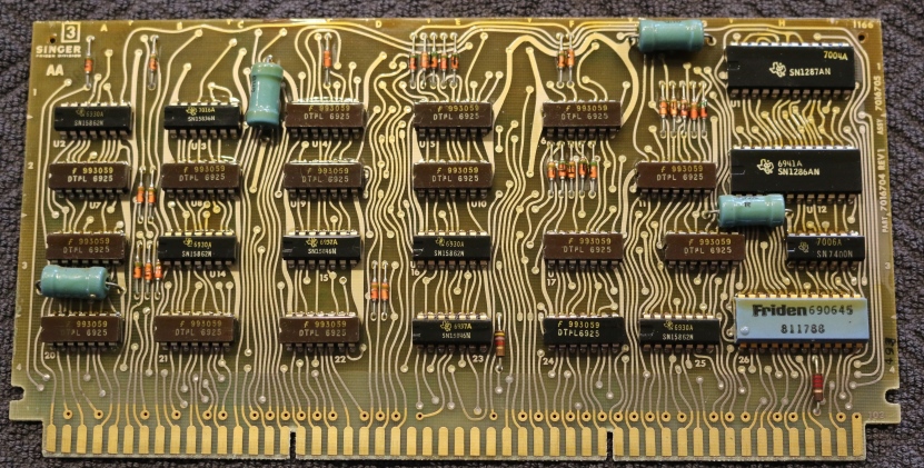 This board contains the "three counter" arithmetic architecture that carries over from the earlier Friden EC-130 calculator. The three counters are implemented in custom TTL (Transistor-Transistor Logic) chips in 24-pin packages. Two of the counter chips are made by Texas Instruments, and the other counter chip is an early Friden-manufactured part, produced by Friden's Research & Development Lab. Friden's R&D Lab had cutting-edge, but small-scale production facilities for integrated circuits, and developed the design for the specialized counter ICs used in the Friden 115x and 116x-series calculators, then provided the design to Texas Instruments, who produced volume quantiies of the chips for Friden. During the early production of both the 115x-series and 116x-series calculators, some of the supply for these counter chips was manufactured by the Friden R&D Lab until Texas Instruments could provide the chips.