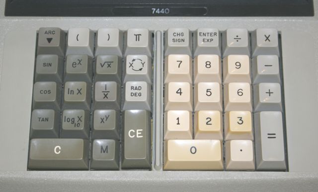 The 7440 blanks the display while calculations are in progress. While not nearly as fast as the 1968-vintage HP 9100 desktop calculator, or the early '70's Wang 700-series machines, answers are typically almost instantaneous, with a few exceptions (logarithmic and trig. functions), some of which can take up to 3/4 second to perform. The 7440 provides a result of 9.08210803 to Mike Sebastian's Calculator Forensics calculation, indicating that the accuracy of the trigonometric functions leaves a bit to be desired.