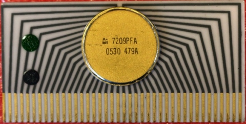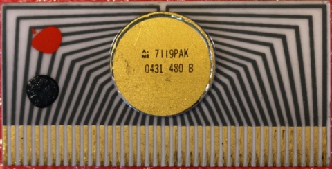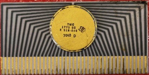 The edge-mount chip packaging consists of a rectangular ceramic base (manufactured by Coors Porcelain, Inc., a division of the famous Coors Beer company) that contains a circular depression in the center, with a gold base metal in the bottom of the depression. The IC chip is bonded to this gold base. Arrayed around the circular inset where the chip is mounted, there are 40 gold contact points, with screen-printed metal traces leading away from them to one edge of the ceramic base. Tiny gold wires are bonded from contact points on the chip to gold contact points arrayed around the inset of the package, providing connections from the chip to the 40 fingers at the edge of the chip. A gold-plated metal lid is then sealed over the chip using a low melting point glass called "frit" to hermetically seal the chip and its delicate connections underneath. The completed package measures approximately 3 1/2" x 1 1/4", and plugs into a special socket mounted on the main logic board. The socket provides a secure connection between the traces on the edge of the packaged to the rest of the circuitry using springy gold-plated contacts, as well a pair of pressure springs that help secure the package in the socket. The socket is made by Litton Industries (under license from Texas Instruments), a company that specialized in aerospace, military and defense electronics that also ended up in the calculator business when it purchased the Monroe Calculating Machine Company in 1958). Oddly, no Litton/Monroe calculator found thus far seems to have used this technology.