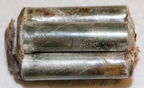 The five new cells were fully charged before the battery pack was put together to facilitate testing without having to charge them using the charging system...eliminating a potential failure vector. The cells were adhered to the original carboard center tube using rubber cement. Jumper wires were carefully soldered to the cells to connect the batteries in series, and the appropriate red (positive) and black (negative) wires were soldered to the battery pack to connect it into the circuitry. The battery pack was wrapped in a layer of high-quality electrical tape to cover the jumper wires to prevent any possibility of a short circuit.