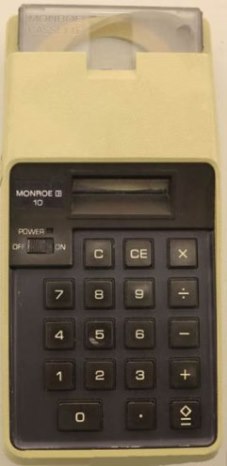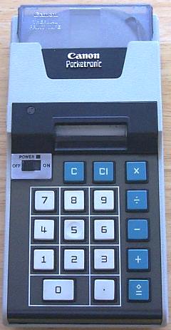 Among the other early players in the rechargeable battery-powered "mini" calculator marketplace was Canon's Pocketronic and Monroe's OEM copy, the Monroe 10. The Canon Pocketronic became a consumer product as a result of an internal skunk-works project at Texas Instruments initiated in the mid-1960's called "Cal-Tech", a calculator way ahead of its time using Large Scale bipolar discretionarily-wired gate-array technology. Cal-Tech never became a consumer product and remained an engineering exercise, though a few of the machines were manufactured. The Pocketronic came out literally years after the Cal-Tech project as a result of a partnership between Canon and Texas Instruments. The Pocketronic definitely benefitted from Texas Instruments' Large-Scale IC technology as it only required a three-chip chip set for its calculating electronics.