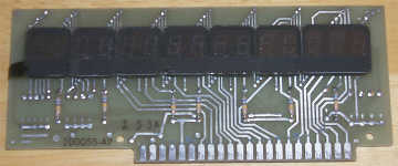The Sperry display modules are designed so that they can be butted up next to each other, maintaining consistent digit spacing. In the case of the US-14, the display modules are all soldered to a separate circuit board that plugs into an edge connector mounted on the main circuit board. Sperry offered special sockets for these display modules which allowed for easy replacement without de-soldering should a module fail(and, they did over time). These sockets were used in the much more expensive Tektronix 21 and 31 calculator displays, but in the case of the US*14, cost was a major consideration, so the sockets were skipped and the display module leads were soldered directly to the circuit board. The display modules use the standard seven-segment digit rendition, with the digits slanted slightly to the right for a more aesthetic appearance. A triangle shaped decimal point is positioned at the lower right of each digit. Heathkit used Sperry modules with larger digits in its first electronic calculator kit, the HK 2008 and Heathkit 2008-A calculators.