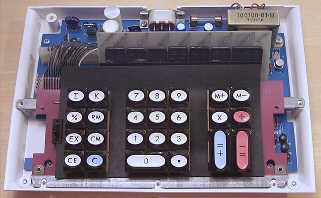 In spite of its low-cost, the US*14 is a nicely built machine. The calculator's guts are all contained on one high quality fiberglass circuit board. The circuit board is single-sided, with wire-jumpers making connections on the component side. Very legible silk-screened component identifications are printed on the circuit board, making it much easier for repair technicians to identify the correct part when doing service. The weakest part of the design of the US* line of calculators is the keyboards. The keyboards use spring-type contacts in sealed modules. For whatever reason, gunk tends to get inside the switch module through the key stem, gumming up the works and causing inconsistent keyboard action, including double and triple entries, as well as missed entries. Every Commodore US*-series machine in the museum has in its possession has had keyboard problems which required remedial efforts (generally a small squirt of De-Ox-It down the key stem of each key) to fix.