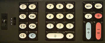 The US*14 provides the standard four math functions, along with a percent calculation. It has a single memory accumulator, with [M+] and [M-] keys to add/subtract the content of the display from the memory accumulator. The [RM] key recalls the content of the memory register to the display, and the [CM] key clears the memory register. The memory status indication mentioned above operates differently than most. Most memory status indicators are lit anytime the memory register contains a non-zero value. Not so with the US*14. A depression of the [M+] or [M-] keys lights the indicator, even if the memory register contains zero as a result of the operation. Pressing the [CM] key clears the memory register, and turns off the memory status indicator. It appears that rather than check the memory register for zero content, the memory status indicator of the US*14 is simply a latch that is set by the operation of the [M+] or [M-] keys, and cleared by the [CM] key. A push-on/push-off [Σ] key allows results of multiplications or divisions to automatically be accumulated in the memory register. It is important to remember to clear the memory register before engaging the summation function, as any as any existing number in the memory register will be included in the total.