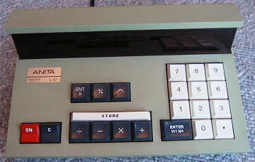 3rd Generation Sumlock/Anita Nixie tube calculator. Ten digit, four function with percent and memory. Essentially a re-implementation of Anita 1011 (see above) using early Large Scale IC's.