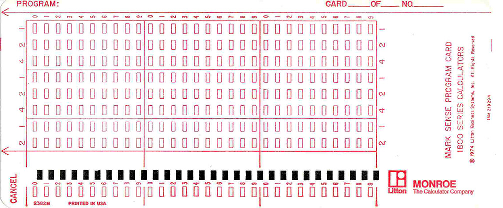 Monroe 1800-Series Calculator Mark Sense Program Card
