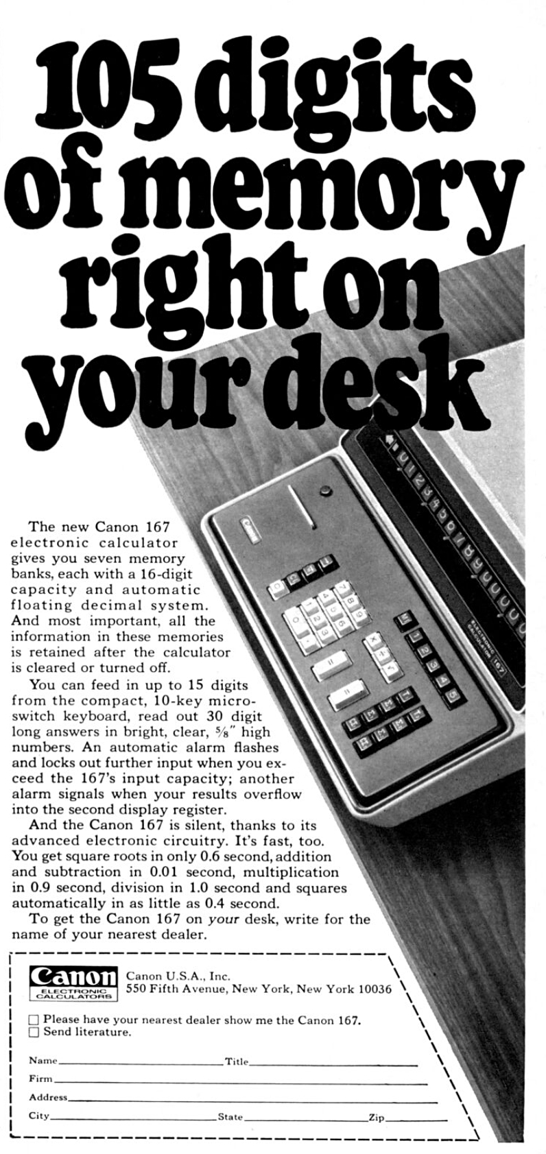 to have a surviving Canon Canola 167, working or not, The Old Calculator Museum would love to hear from you.