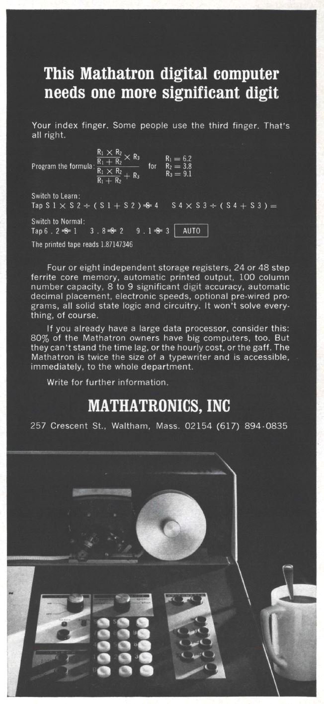An early advertisement for the first-generation Mathatronics Mathatron calculators April, 1965