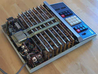 Nippon Columbia first marketed this calculator in Japan as the Columbia COLCA (COLumbia CAlculator) 61A. Not long after its introduction in Japan, Denon, the US marketing arm of Nippon Columbia, introduced the machine to the North American market as the Denon 61A4. This calculator was built at a time when integrated circuits were just starting to become available for use in anything but military equipment, space applications, or large-scale computers. The cost of integrated circuits was still quite high in comparison to discrete component logic. However, the integration of a number of logic gates, or a few flip flops into a single small package made it possible to make the machines smaller, a real consideration when desktop space always seems to be a limited commodity. So, as IC technology became available, calculator manufacturers started to integrate (excuse the pun) the technology into their designs. The 61A4 is a hybrid machine, using some integrated circuit logic elements, and some discrete component logic. This machine sits pretty much in the middle of the range of hybrid machines at the time, with an example of the low-integration hybrid calculator being the Burroughs C3350; and a high-integration example being the Brother Calther 412.