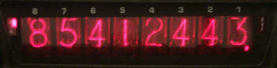 The ICM 816 uses eight genuine Burroughs B5853ST Nixie tubes for its display. Each tube contains the digits zero through nine, and a right-hand decimal point. The display is driven by an unknown IC (no part number or other identification) in a 14-pin DIP package, as well as discrete transistor drivers. The display provides leading zero suppression. The Nixies tubes sit behind a red filter that tints the orange Neon-glow display of the Nixies more toward the red end of the spectrum. Sign and overflow conditions are indicated by small discrete neon tubes located at the left (NEGative) and right (OVerFlow) ends of the bank of Nixie tubes.