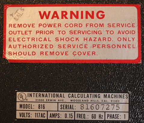 Serial Number Tag on one of the Museum's ICM 816 calculators