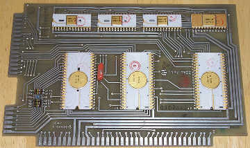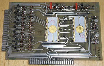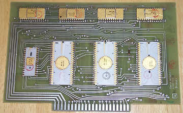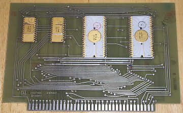 Some of the boards' functions are fairly obvious from their names, but a few require some explanation. The Printer Drive board contains HTL03 and HTL14 chips, along with transistorized driver circuitry for the printer's solenoid-activated print hammers. The HTL03 and HTL14 chips combine forces to take the timing signals from the printer, as well as the data from other HTL chips that represents what is to be printed, and generates the necessary timing signals to fire the print hammers to print out the data, as well as controlling the ribbon color selection (black or red) and advancing the paper. The Data Memory board contains the RAM (Random Access Memory) where the memory and other working registers of the calculator reside. Along with the four HTL00 Dynamic RAM chips, the remaining IC's (HTL04, HTL05, HTL06 and HTL10) handle the addressing and refresh of the memory.