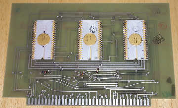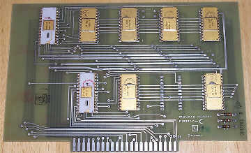The 1665 is built in a modular fashion, with four main components. The printer, power supply, keyboard assembly, and the logic. The logic of the machine consists seven logic boards that plug into a printed-circuit backplane. Each logic circuit board is made out of high-quality fiberglass board material, with plated through holes to connect the two sides of the board. Each board has edge fingers across the bottom of the board that plug into a connector in the backplane. The function of each of the circuit boards is conveniently etched on each board. At the left end of the card cage, a small board contains voltage regulation circuitry for the power supply. To the right of this power supply board, the remaining seven boards make up the logic of the machine. The logic boards, left to right in the chassis as shown above, are: Printer Drive, Data Memory, Program Memory, Control, Compiler/Flags, LEMP, and (the optional) CLEMP.