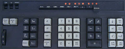 The 1665 is quite a capable machine for the early 1970's. The calculator boasts a wealth of mathematical functions including trig, logarithms, roots and powers, and factorials. Along with the higher-level math functions, the calculator is fully programmable, allowing rather complex programs to be written to perform just about any kind of mathematical calculation that can be expressed within the 128-step (or optionally, 256-step) program memory of the machine. As with most of the machines in the first generation of Compucorp/Monroe calculators, the 1665 has a total of ten memory registers, numbered zero through nine. Registers 7, 8, and 9 are general purpose registers used by some of the math functions of the machine, leaving registers 0 through 6 for more general user needs. Since the calculator uses IC-based Random Access Memory (RAM) that is volatile (the content of memory is lost when the machine is powered off) for program storage, the calculator has the ability to allow an optional external punched card reader (the CR-1 Card Reader) to be connected to allow for easy loading of programs into the memory of the calculator from punched cards.