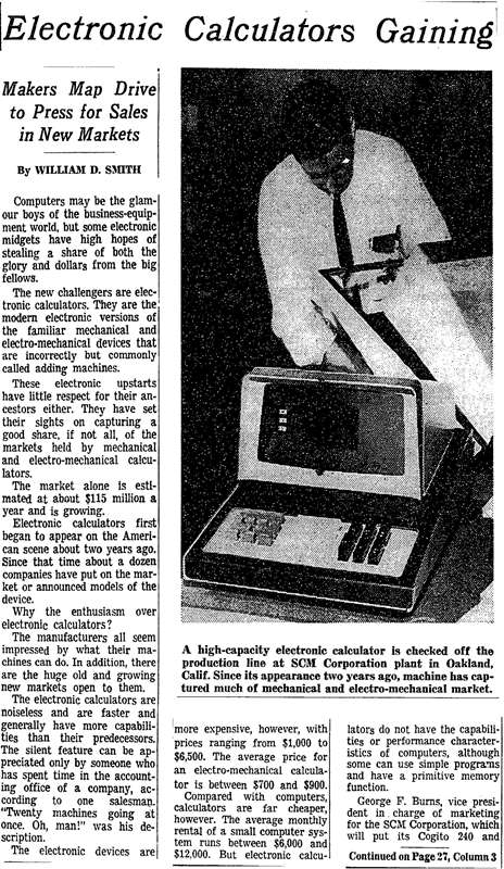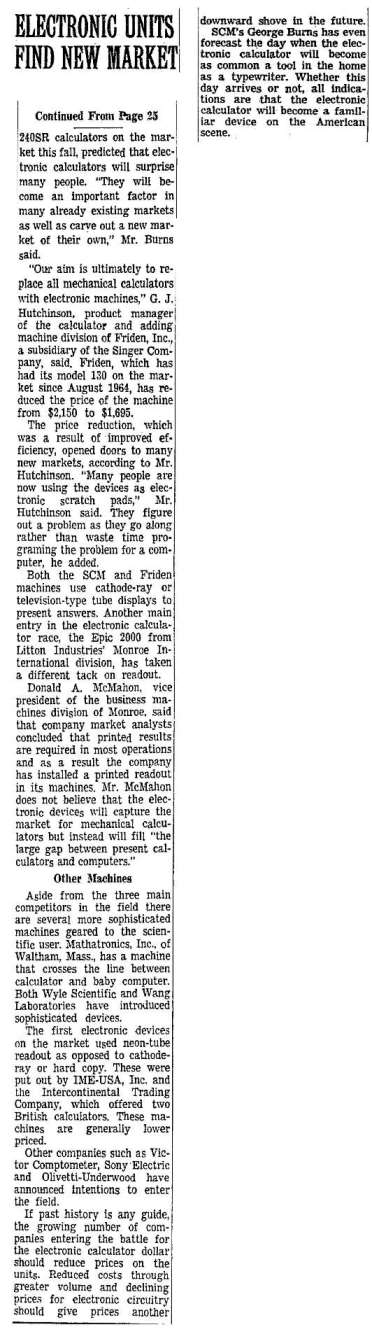 Article on state of the electronic calculator market from Summer of 1965 The New York Times, August 5, 1965