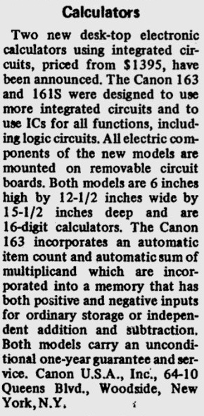 News Archive - US Announcement of Canon 161S and Canon 163 Calculators