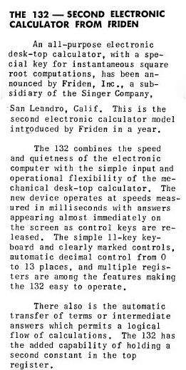 the Friden 132 began sometime in the spring of '65. Given lead-times