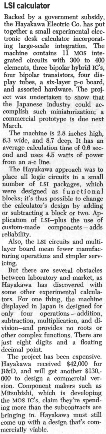 News Archive - Report on Hayakawa Electric (Sharp) Developing Electronic Calculator Using LSI ICs