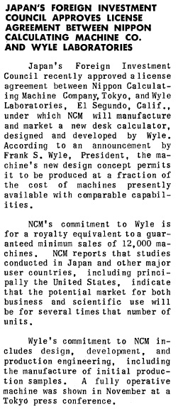 News Archive - Announcment of Licensing Agreement between Nippon Calculating Machine Co. and Wyle Laboratories