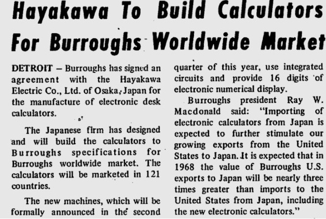 and Burroughs Corp. for Hayakawa Electric to manufacture electronic calculators to Burroughs' specifications for sale by
