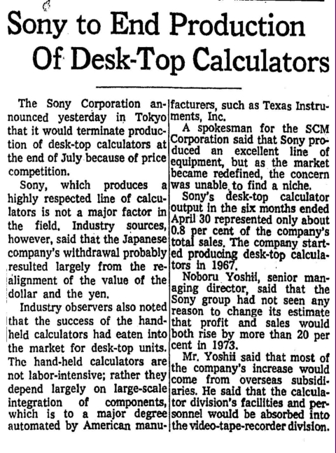 Sony Announces End of Electronic Calculator Production at end of July, 1973. The New York Times, June 1, 1973